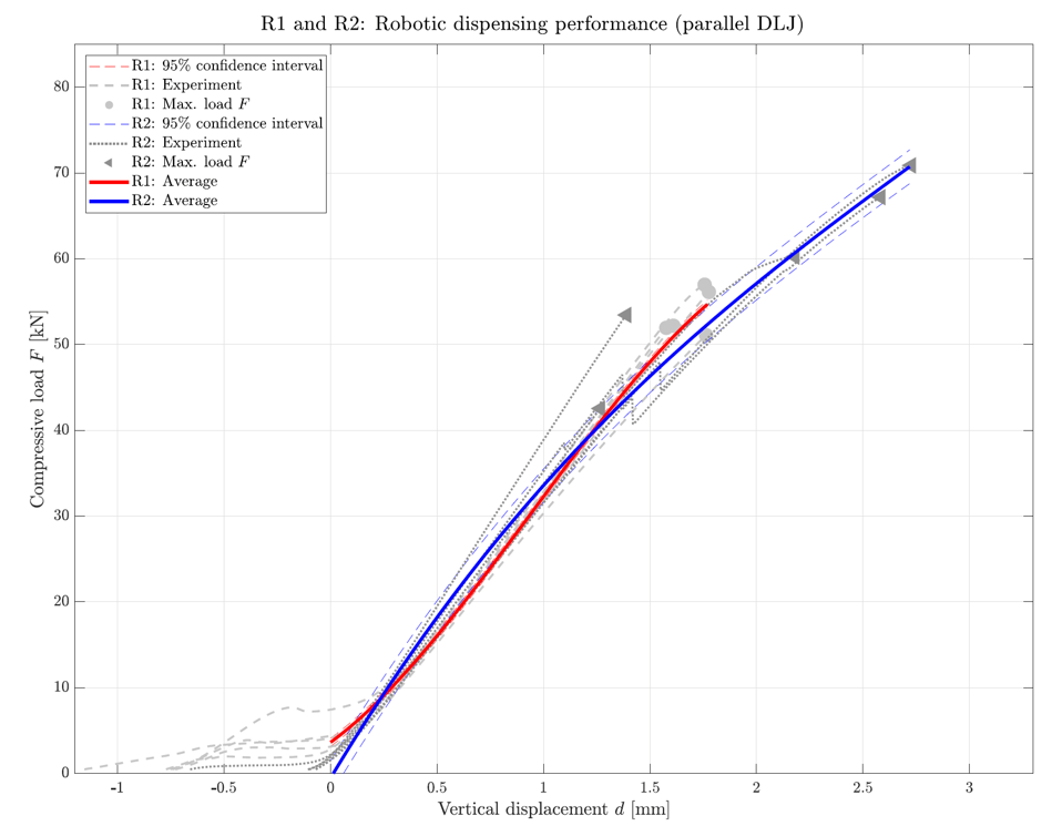 The shear tests are displacement controlled at a rate of 1 mm/min, and achieved a remarkable shear strength of around 55 kN. Moreover, the robotic process and the proposed screw-clamping to introduce the curing pressure both performed similar, or in many cases better, than the traditional fabrication process. Another take-away from these experiments is the extremely high stiffness of the joint. For 55 kN, displacements of only 1.72 mm were recorded. This also is evident from the type of failure occurring, as it was extremely brittle and explosive. These failure modes occurred where the adhesive joint itself failed very suddenly. Other types of failures occurred as well, often related to the timber failing. These types of failures initiated in the center of the middle timber member, which started splitting parallel to the grain. This behavior was caused by the forces developing normal to the adhesive planes.