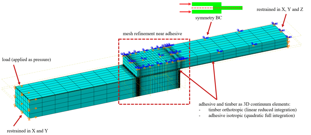 - Both the timber and adhesive are modelled as 3D volume elements. In the adhesive these elements are quadratic HEX bricks, as well as in the transition zone of the timber. The remainder of the timber consists of linear elements to reduce computational times.