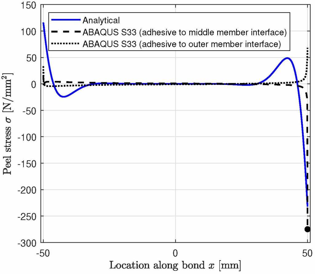 There are some differences between the magnitudes in the FEM and analytical model. This can be due to a variety of reasons, some of which having to do with the assumptions and limitations of the analytical model. Moreover, the combination of a very stiff and thin adhesive layer compared to the relatively pliable and thick timber members can also cause different effects. Moreover, there are certain parameters in the models that have been proven to affect the magnitudes of the results significantly. For example, the adhesive thickness can greatly affect the magnitude of the stresses, and in this case an assumption has been made for this parameter.