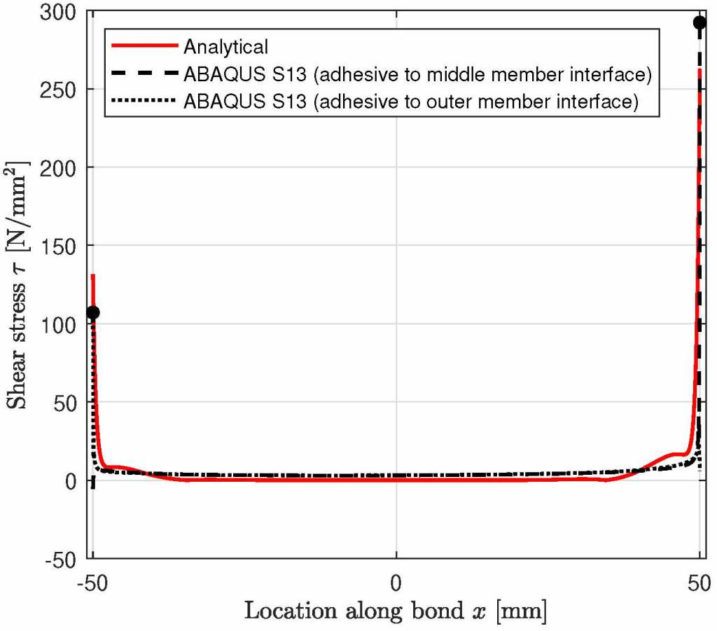 In addition to this model, an analytical model for DLJ joints is compared as well. The results can be seen in the graphs. It can be seen that the distribution of the stresses is relatively similar. It corresponds with literature in the sense that there are very localized stress peaks near the ends of the adhesive, which dictate failure of the joint.