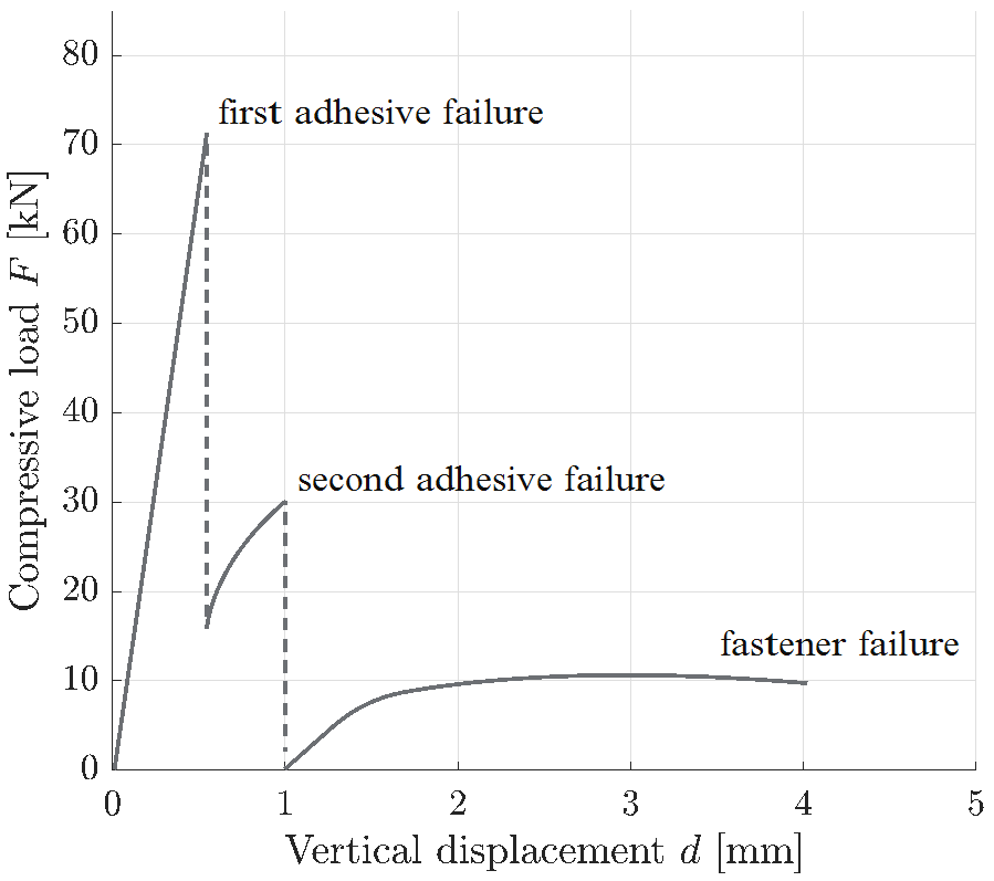 Another type of test that has been performed is the one where the screws were left in the connection. So, this is a connection with two adhesive layers as well as two screws through them. The idea behind this is twofold: The screws need not to be removed reducing the amount of actions the robot must perform, as well as it function as a second load path. During these tests interesting findings were observed, as when the first adhesive layer fails it cannot disassemble as the screws keep the joint together. For increased loading, the resistance in turn starts increasing again until roughly half the total failure load. At this point, the second adhesive layer fails and the joint suddenly becomes one that is only fastened using two screws. For increased loading, the screws start taking over the load, but in this case was very small compared to that of the adhesive layers. This is due to the fact that those two screws were far from designed for a load of 60 kN. However, these effects can already be considered (and designed for) during the initial phases. This offers the possibility that the joint can be designed such that in case of an accidental load the screws provide a ductile second load path, while during normal circumstances the adhesive provides a very stiff joint with little deflections. The conceptual behavior of such a hybrid joint is shown in the figure below.