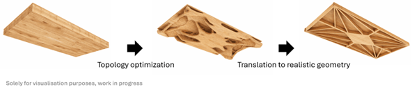 Rethinking the design of structural floor slabs involves more than only selecting more sustainable materials, it also requires a reconsideration of geometry and structural form. Traditional slab systems are often based on flat, uniform geometries that are easy to design and construct but inefficient in terms of material use. Even though switching from traditional construction materials for slabs, such as reinforced concrete, to more innovative solutions, such as cross-laminated-timber already drastically decreases the embodied carbon (Oh et al, 2019), there are other possibilities to further reduce the environmental impact. By exploring more efficient geometries, engineers can significantly reduce the amount of material required while maintaining or even improving structural performance. Tools like topology optimization and parametric design allow for the creation of structurally efficient forms that place material only where it is needed, reducing the total material usage in construction.